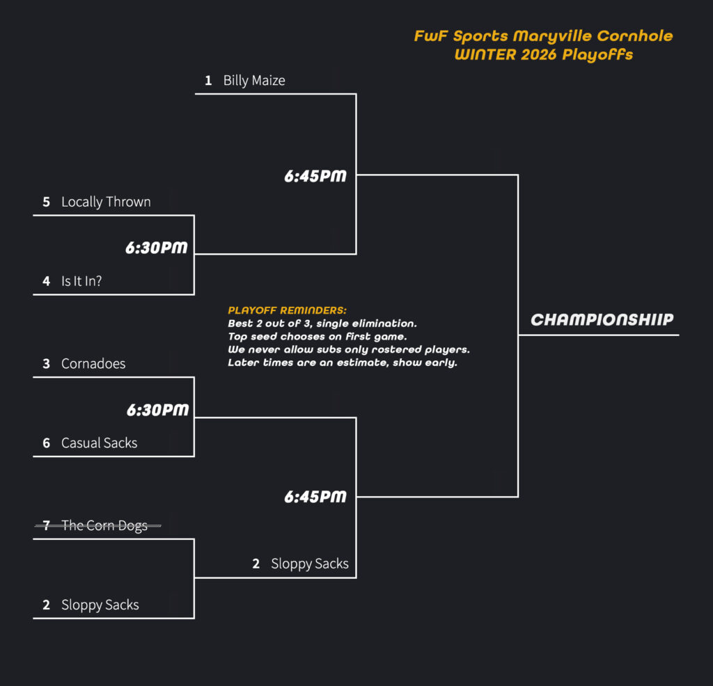 Schedule Knoxville Spring 2026 Schedule DateEventTime/ResultsVenue 2026-04-28 18:30:00April 28, 2026 Cornographic Material vs Bags Gone Wild 18:30:006:30 pmHexagon Brewing Co.2026-04-28 18:30:00April 28, 2026 Id Shuck Me vs Sack To The Future 18:30:006:30 pmHexagon Brewing Co.2026-04-28 18:30:00April 28, 2026 Slide It In vs Tossaholics 18:30:006:30 pmHexagon Brewing Co.2026-04-28 18:30:00April 28, 2026 Corn to be Wild vs Holewreckers 18:30:006:30 pmHexagon Brewing Co.2026-04-28 18:30:00April 28, 2026 Exes and Holes vs Bags of Fun 18:30:006:30 pmHexagon Brewing Co.2026-04-28 18:30:00April 28, 2026 Is It In vs Board Bangers 18:30:006:30 pmHexagon Brewing Co.2026-05-05 18:30:00May 5, 2026 Bags Gone Wild vs Is It In 18:30:006:30 pmHexagon Brewing Co.2026-05-05 18:30:00May 5, 2026 Bags of Fun vs Sack To The Future 18:30:006:30 pmHexagon Brewing Co.2026-05-05 18:30:00May 5, 2026 Slide It In vs Cornographic Material 18:30:006:30 pmHexagon Brewing Co.2026-05-05 18:30:00May 5, 2026 Corn to be Wild vs Board Bangers 18:30:006:30 pmHexagon Brewing Co.2026-05-05 18:30:00May 5, 2026 Exes and Holes vs Holewreckers 18:30:006:30 pmHexagon Brewing Co.2026-05-05 18:30:00May 5, 2026 Id Shuck Me vs Tossaholics 18:30:006:30 pmHexagon Brewing Co.2026-05-12 18:30:00May 12, 2026 Bags of Fun vs Bags Gone Wild 18:30:006:30 pmHexagon Brewing Co.2026-05-12 18:30:00May 12, 2026 Id Shuck Me vs Is It In 18:30:006:30 pmHexagon Brewing Co.2026-05-12 18:30:00May 12, 2026 Tossaholics vs Sack To The Future 18:30:006:30 pmHexagon Brewing Co.2026-05-12 18:30:00May 12, 2026 Corn to be Wild vs Cornographic Material 18:30:006:30 pmHexagon Brewing Co.2026-05-12 18:30:00May 12, 2026 Exes and Holes vs Slide It In 18:30:006:30 pmHexagon Brewing Co.2026-05-12 18:30:00May 12, 2026 Holewreckers vs Board Bangers 18:30:006:30 pmHexagon Brewing Co.2026-05-19 18:30:00May 19, 2026 Cornographic Material vs Exes and Holes 18:30:006:30 pmHexagon Brewing Co.2026-05-19 18:30:00May 19, 2026 Id Shuck Me vs Corn to be Wild 18:30:006:30 pmHexagon Brewing Co.2026-05-19 18:30:00May 19, 2026 Bags Gone Wild vs Tossaholics 18:30:006:30 pmHexagon Brewing Co.2026-05-19 18:30:00May 19, 2026 Board Bangers vs Sack To The Future 18:30:006:30 pmHexagon Brewing Co.2026-05-19 18:30:00May 19, 2026 Is It In vs Bags of Fun 18:30:006:30 pmHexagon Brewing Co.2026-05-19 18:30:00May 19, 2026 Holewreckers vs Slide It In 18:30:006:30 pmHexagon Brewing Co.2026-05-26 18:30:00May 26, 2026 Cornographic Material vs Holewreckers 18:30:006:30 pmHexagon Brewing Co.2026-05-26 18:30:00May 26, 2026 Id Shuck Me vs Exes and Holes 18:30:006:30 pmHexagon Brewing Co.2026-05-26 18:30:00May 26, 2026 Slide It In vs Bags Gone Wild 18:30:006:30 pmHexagon Brewing Co.2026-05-26 18:30:00May 26, 2026 Corn to be Wild vs Sack To The Future 18:30:006:30 pmHexagon Brewing Co.2026-05-26 18:30:00May 26, 2026 Is It In vs Tossaholics 18:30:006:30 pmHexagon Brewing Co.2026-05-26 18:30:00May 26, 2026 Bags of Fun vs Board Bangers 18:30:006:30 pmHexagon Brewing Co.2026-06-02 18:30:00June 2, 2026 Cornographic Material vs PLAYOFFS 18:30:006:30 pmHexagon Brewing Co.2026-06-02 18:30:00June 2, 2026 Id Shuck Me vs PLAYOFFS 18:30:006:30 pmHexagon Brewing Co.2026-06-02 18:30:00June 2, 2026 Slide It In vs PLAYOFFS 18:30:006:30 pmHexagon Brewing Co.2026-06-02 18:30:00June 2, 2026 Corn to be Wild vs PLAYOFFS 18:30:006:30 pmHexagon Brewing Co.2026-06-02 18:30:00June 2, 2026 Exes and Holes vs PLAYOFFS 18:30:006:30 pmHexagon Brewing Co.2026-06-02 18:30:00June 2, 2026 Holewreckers vs PLAYOFFS 18:30:006:30 pmHexagon Brewing Co.2026-06-02 18:30:00June 2, 2026 Is It In vs PLAYOFFS 18:30:006:30 pmHexagon Brewing Co.2026-06-02 18:30:00June 2, 2026 Bags of Fun vs PLAYOFFS 18:30:006:30 pmHexagon Brewing Co.2026-06-02 18:30:00June 2, 2026 Board Bangers vs PLAYOFFS 18:30:006:30 pmHexagon Brewing Co.2026-06-02 18:30:00June 2, 2026 Tossaholics vs PLAYOFFS 18:30:006:30 pmHexagon Brewing Co.2026-06-02 18:30:00June 2, 2026 Sack To The Future vs PLAYOFFS 18:30:006:30 pmHexagon Brewing Co.2026-06-02 18:30:00June 2, 2026 Bags Gone Wild vs PLAYOFFS 18:30:006:30 pmHexagon Brewing Co. MARYVILLE – Spring 2026 Schedule DateEventTime/ResultsVenue 2026-04-28 18:30:00April 28, 2026 Is It In Maryville vs Corn In The USA 18:30:006:30 pmBlackhorse Brewery2026-04-28 18:30:00April 28, 2026 Shuck Yeah vs Sizzling Sacks 18:30:006:30 pmBlackhorse Brewery2026-04-28 18:30:00April 28, 2026 Sloppy Sacks vs Cornholios 18:30:006:30 pmBlackhorse Brewery2026-04-28 18:30:00April 28, 2026 Dirt Bags vs The Hole Enchilada 18:30:006:30 pmBlackhorse Brewery2026-04-28 18:30:00April 28, 2026 Cornadoes vs Cobs of Fury 18:30:006:30 pmBlackhorse Brewery2026-04-28 18:30:00April 28, 2026 Comeback Crew vs Corn Stalkers 18:30:006:30 pmBlackhorse Brewery2026-05-05 18:30:00May 5, 2026 Is It In Maryville vs Sizzling Sacks 18:30:006:30 pmBlackhorse Brewery2026-05-05 18:30:00May 5, 2026 Shuck Yeah vs Corn In The USA 18:30:006:30 pmBlackhorse Brewery2026-05-05 18:30:00May 5, 2026 Sloppy Sacks vs The Hole Enchilada 18:30:006:30 pmBlackhorse Brewery2026-05-05 18:30:00May 5, 2026 Dirt Bags vs Cornholios 18:30:006:30 pmBlackhorse Brewery2026-05-05 18:30:00May 5, 2026 Cornadoes vs Corn Stalkers 18:30:006:30 pmBlackhorse Brewery2026-05-05 18:30:00May 5, 2026 Comeback Crew vs Cobs of Fury 18:30:006:30 pmBlackhorse Brewery2026-05-12 18:30:00May 12, 2026 Is It In Maryville vs Cornholios 18:30:006:30 pmBlackhorse Brewery2026-05-12 18:30:00May 12, 2026 Shuck Yeah vs The Hole Enchilada 18:30:006:30 pmBlackhorse Brewery2026-05-12 18:30:00May 12, 2026 Sloppy Sacks vs Corn Stalkers 18:30:006:30 pmBlackhorse Brewery2026-05-12 18:30:00May 12, 2026 Dirt Bags vs Cobs of Fury 18:30:006:30 pmBlackhorse Brewery2026-05-12 18:30:00May 12, 2026 Cornadoes vs Corn In The USA 18:30:006:30 pmBlackhorse Brewery2026-05-12 18:30:00May 12, 2026 Comeback Crew vs Sizzling Sacks 18:30:006:30 pmBlackhorse Brewery2026-05-19 18:30:00May 19, 2026 Is It In Maryville vs Comeback Crew 18:30:006:30 pmBlackhorse Brewery2026-0